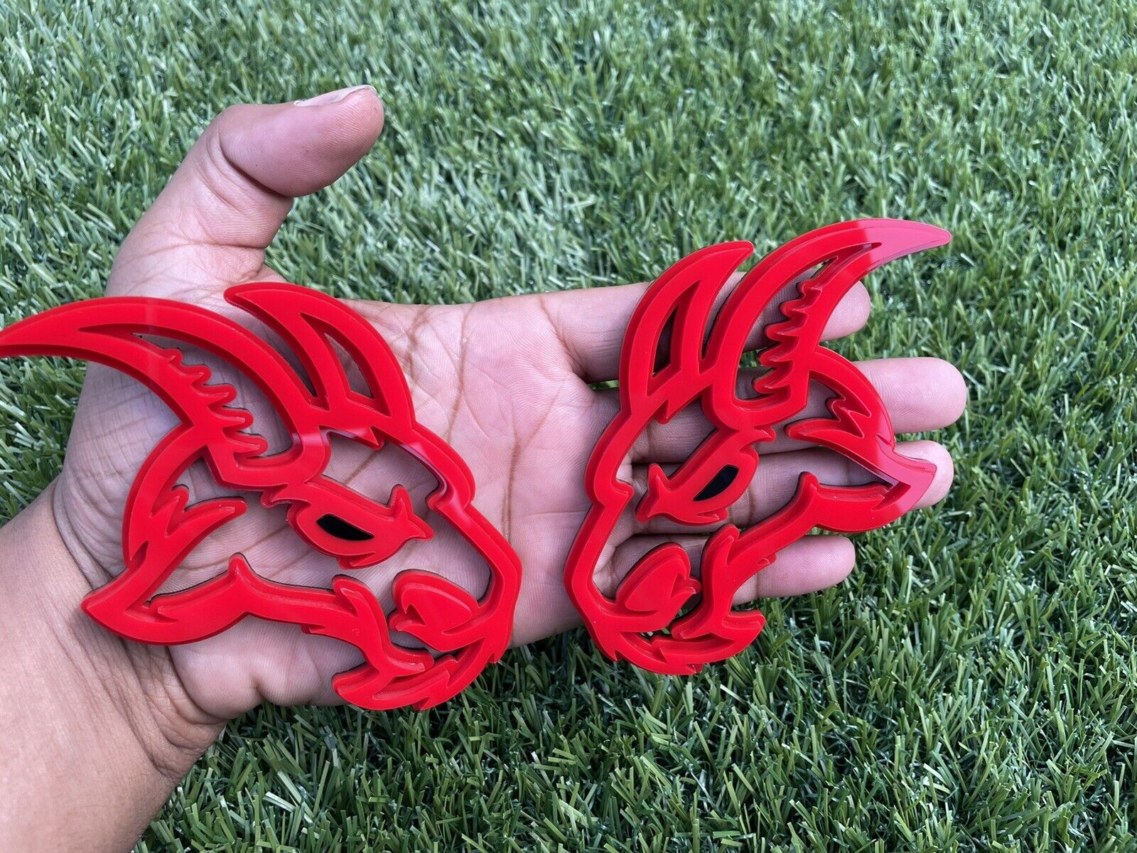 Brand New Custom Angry Goat Evil Eye Red On Red emblem badge. Made of high quality automotive plastic material that will last the life of your vehicle. Has top quality strong bond double sided tape on back, made for all weather conditions. Different colors available.