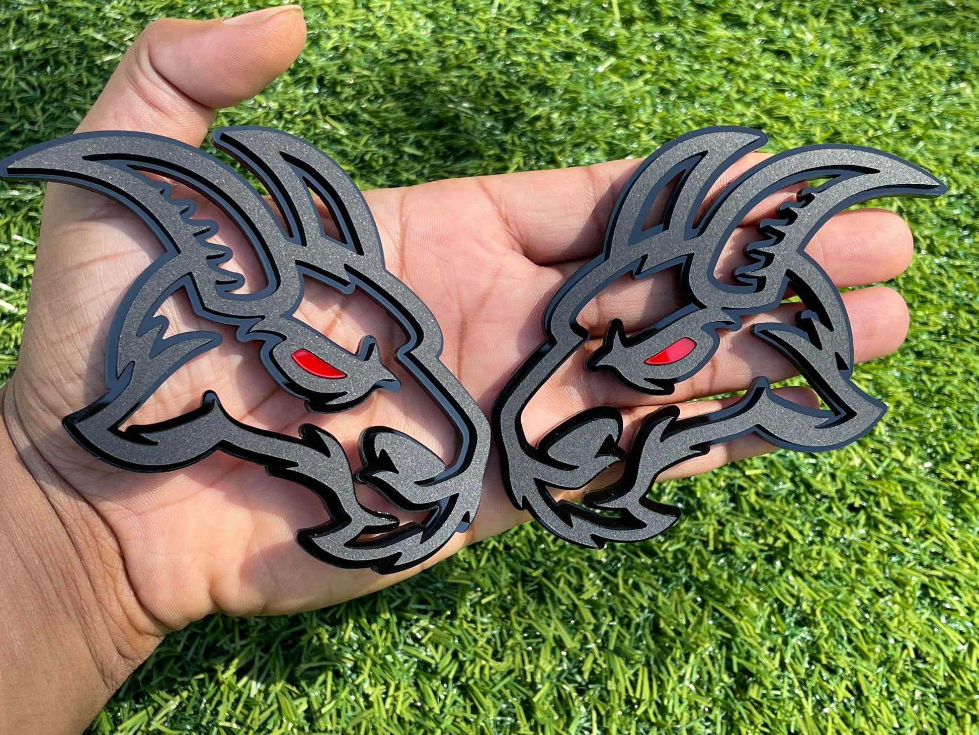 Custom matte Black on Glossy Black Angry Red Eye Goat emblem badge. made of high-quality automotive plastic material that will last the life of your vehicle. has top quality strong bond double sided tape on back, made for all weather conditions. Different colors available.
