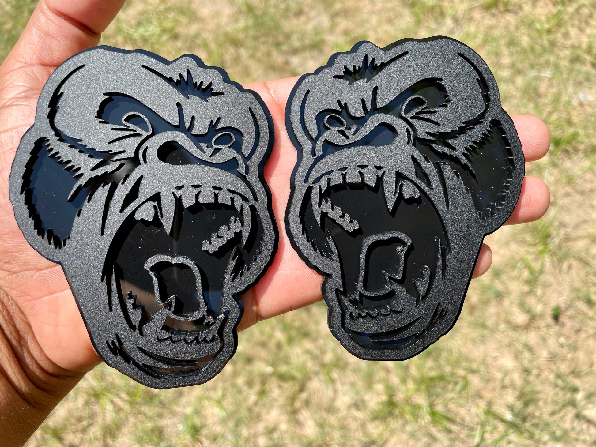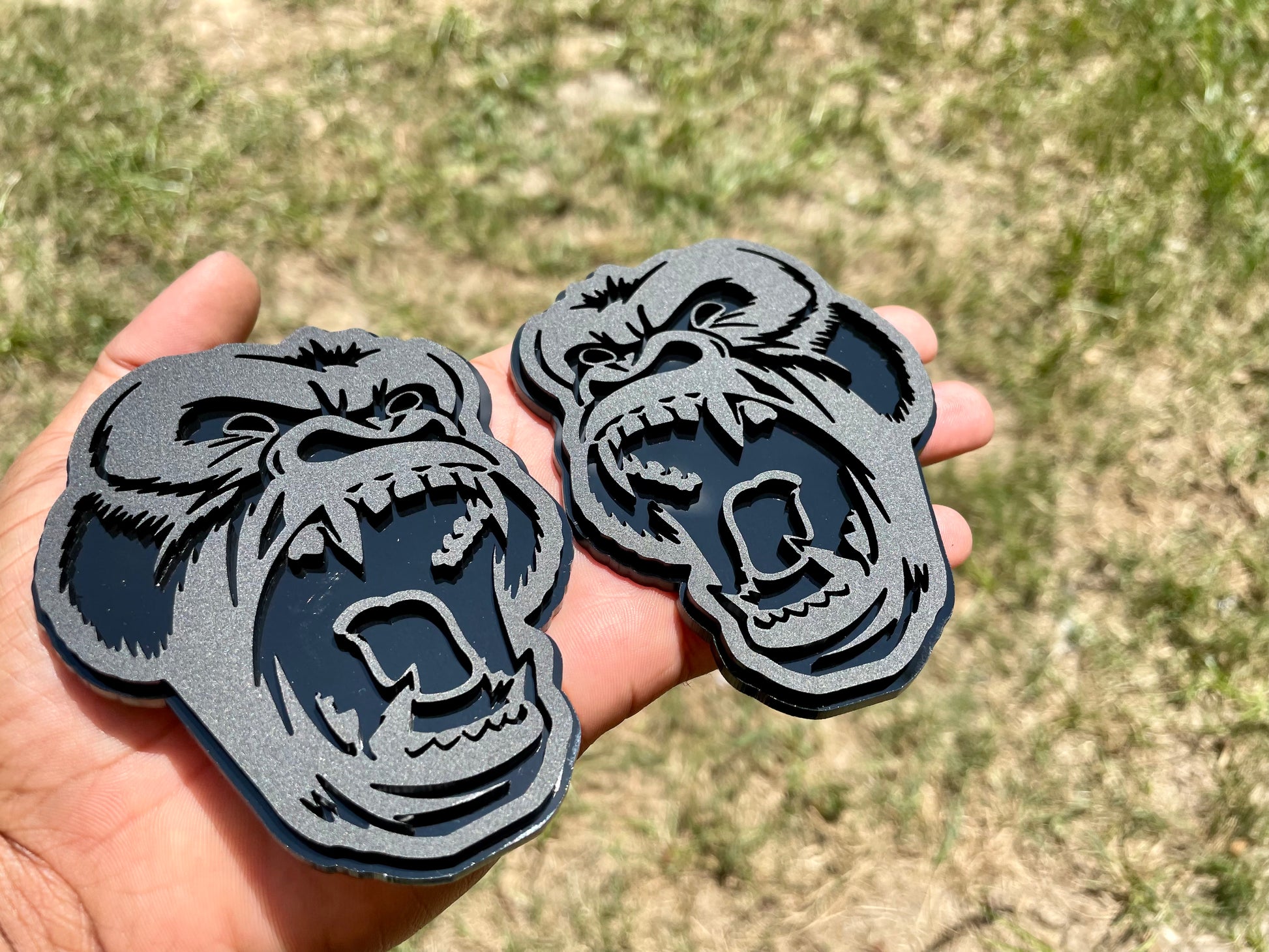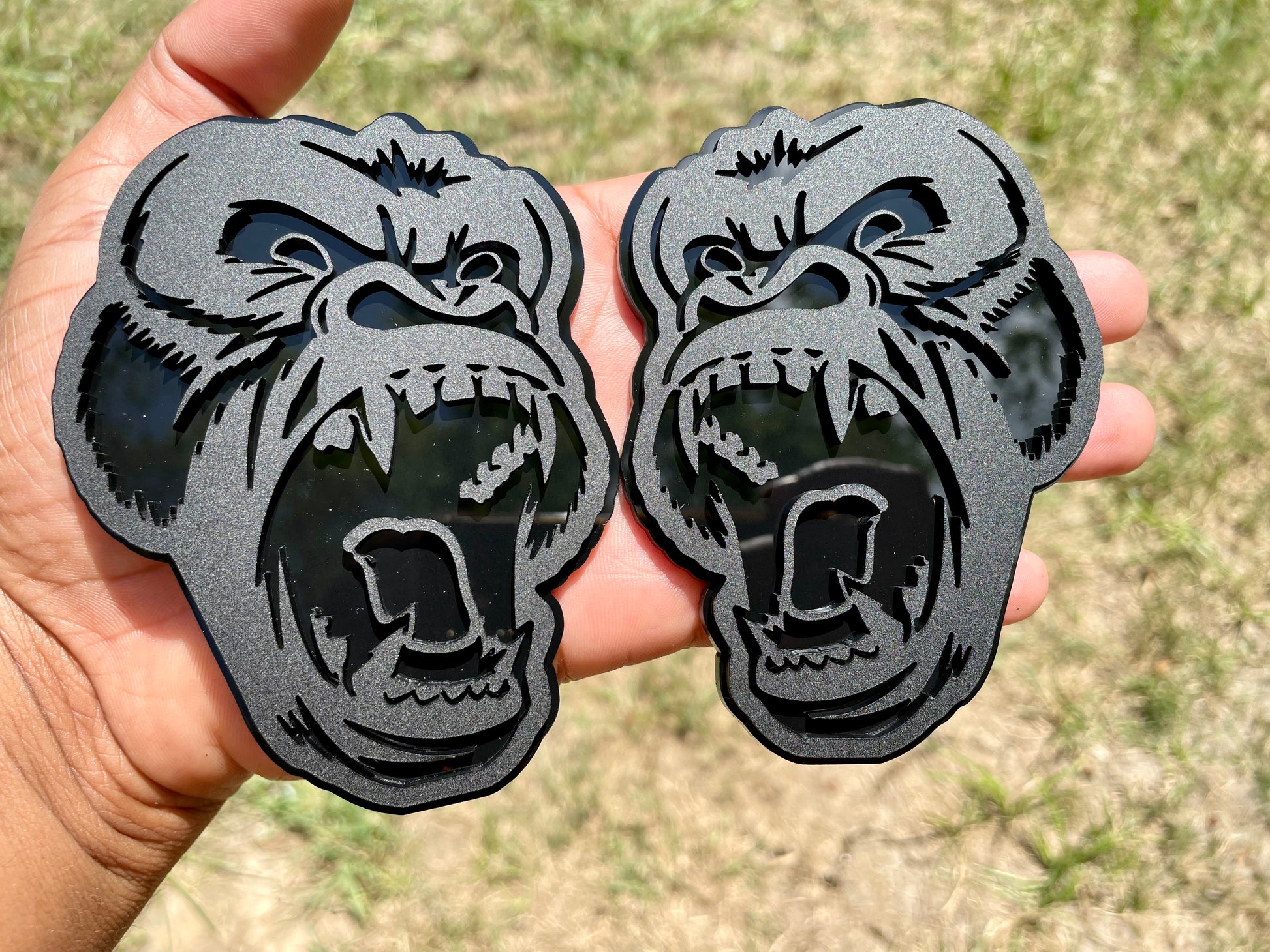 Brand New Custom Angry Gorilla Ape emblem badge set. Made of high quality automotive plastic material that will last the life of your vehicle. Has top quality strong bond double sided tape on back, made for all weather conditions. Different colors available.