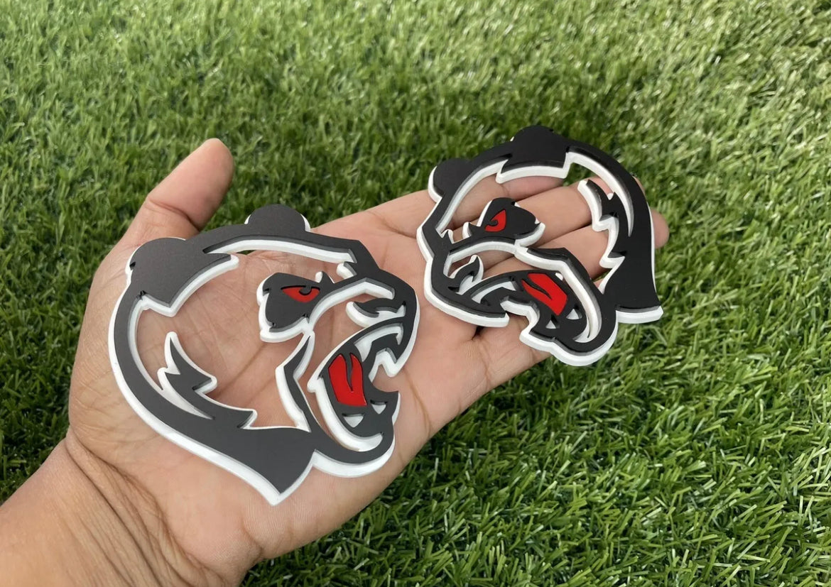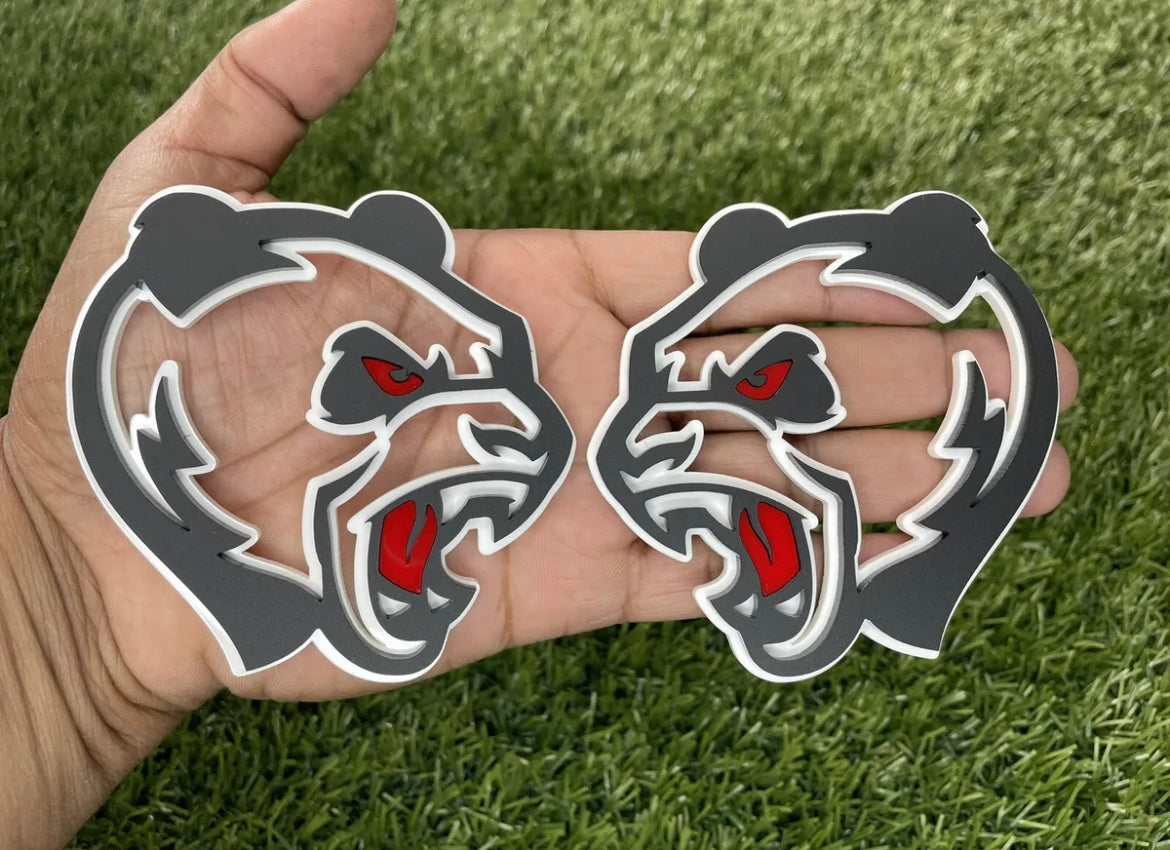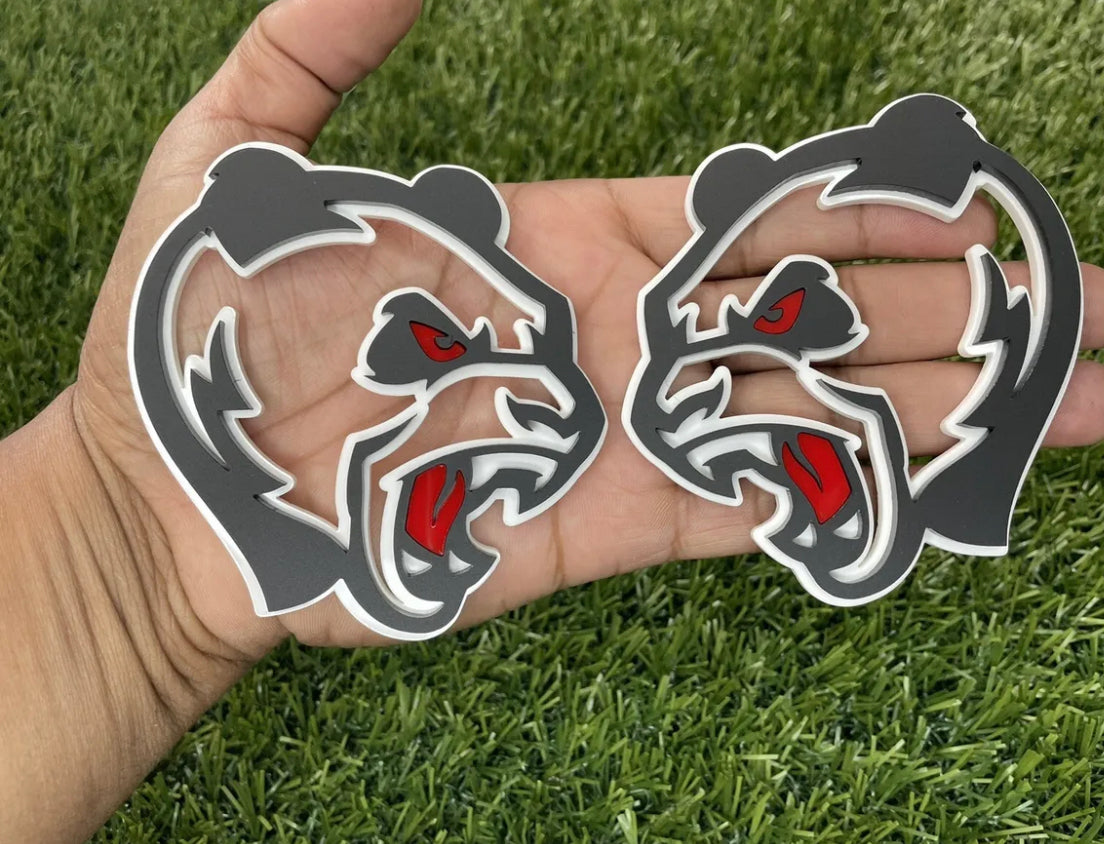 Brand New Custom Angry panda emblem badge’s. Made of high quality automotive plastic material that will last the life of your vehicle. Has top quality strong bond double sided tape on back, made for all weather conditions. Different colors available.