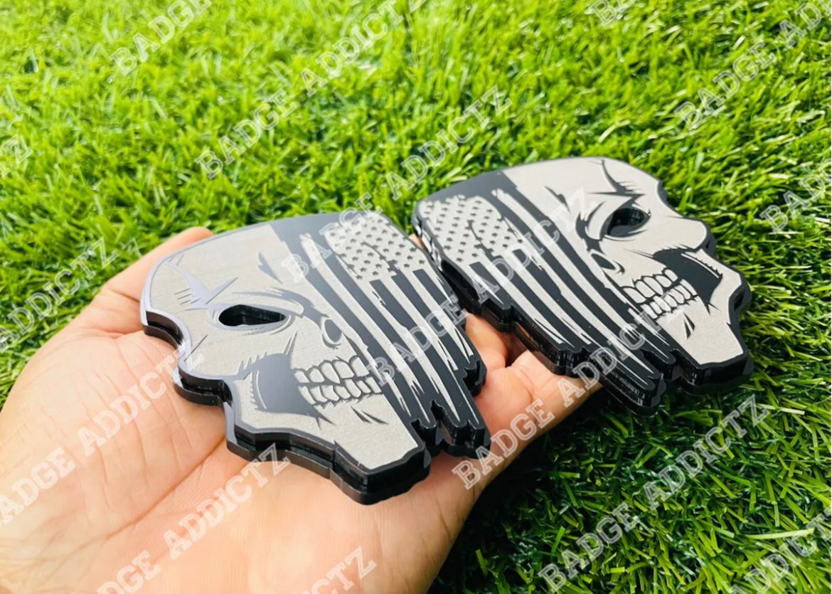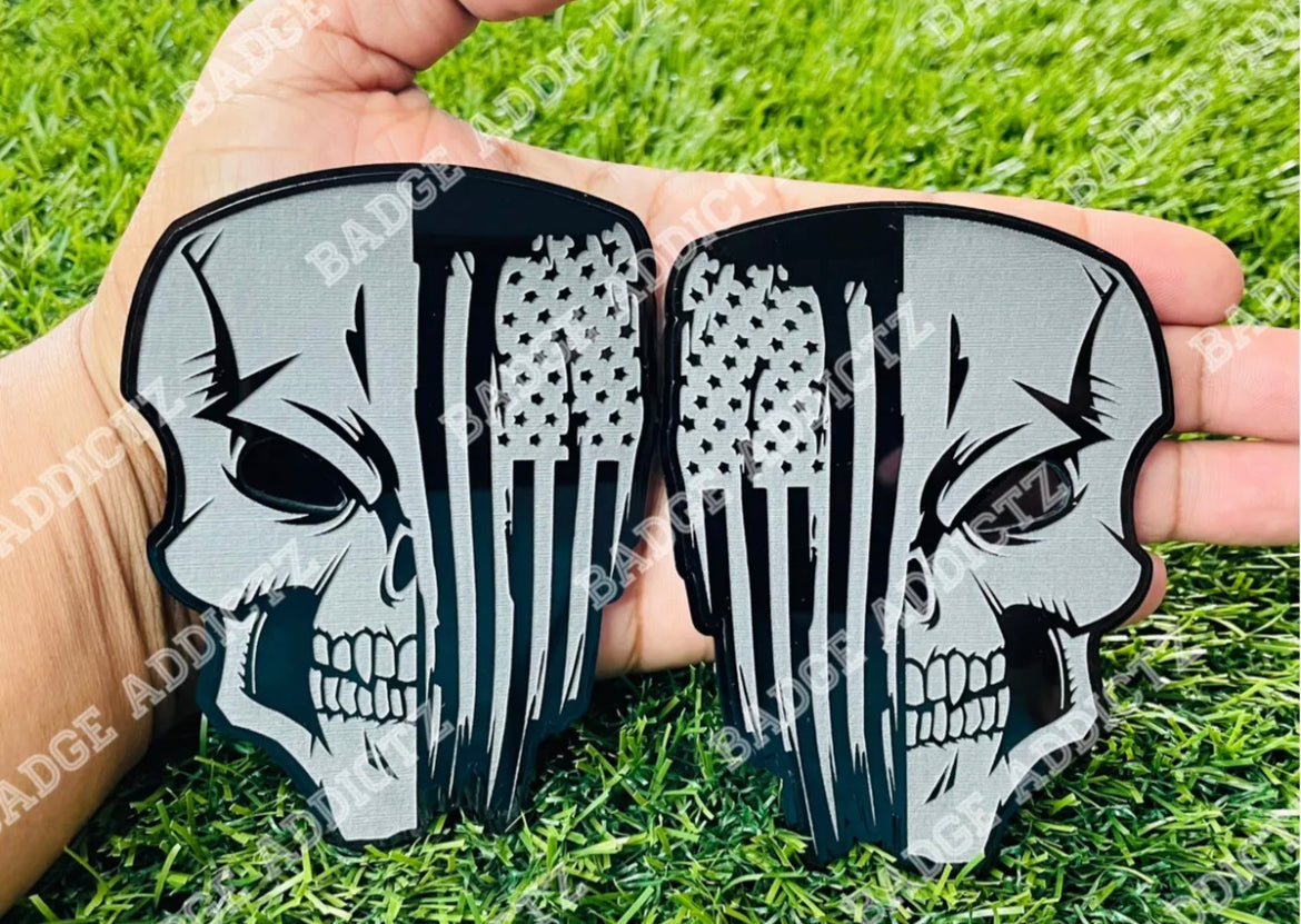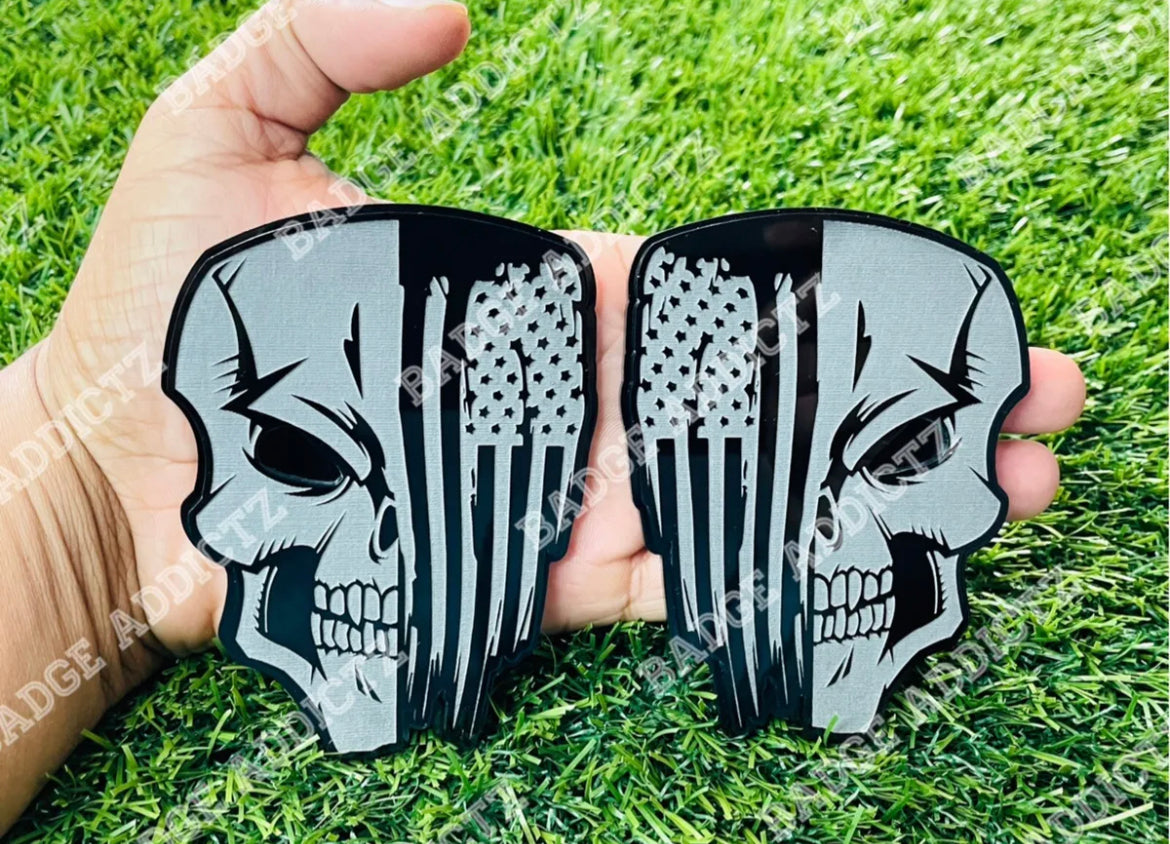 Brand New Custom Angry Skull Flag emblem badge’s. Made of high quality automotive plastic material that will last the life of your vehicle. Has top quality strong bond double sided tape on back, made for all weather conditions. Different colors available.