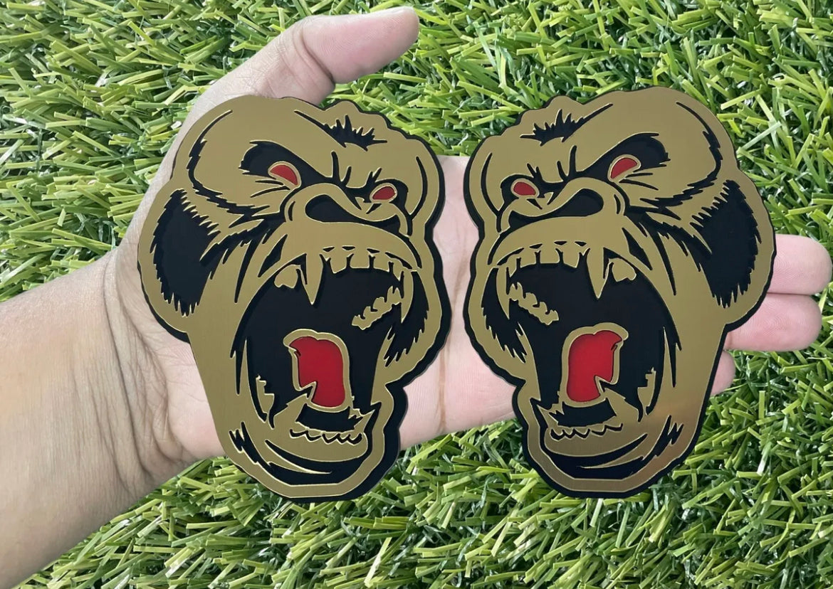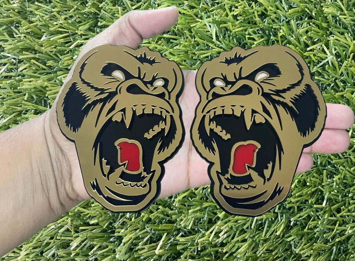 Gold Brushed Metal Angry Gorilla Ape Emblem Badges with Eyes Custom New