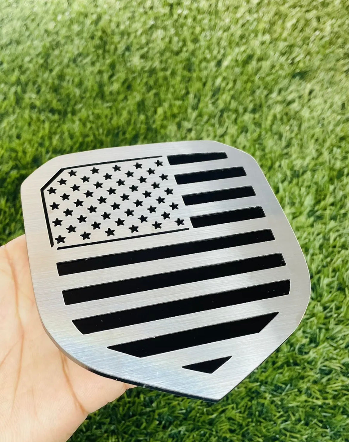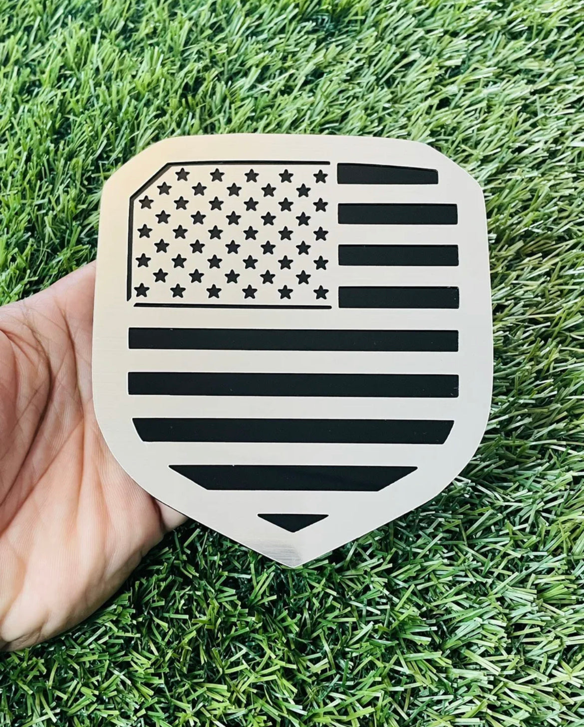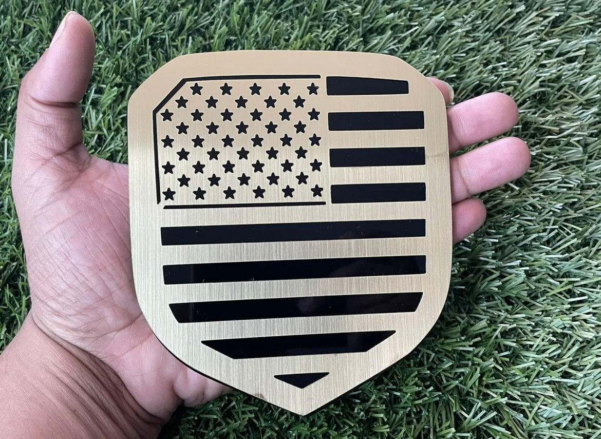 RAM Shield Grille Emblem badge 2009-2018 fit 1500-2500-3500 flag. Custom thin layer brushed silver or brushed gold finish Sold as a Solid single badge. As pictured. Made in the USA Brand New Custom Shield Grille Emblem. Made of high quality automotive plastic material that that has thin metal first layer. will last the life of your vehicle. Has top quality strong bond double sided tape on back, made for all weather conditions. Different colors available. Sold as one solid piece. As pictured in photo Fast Shipping!! |