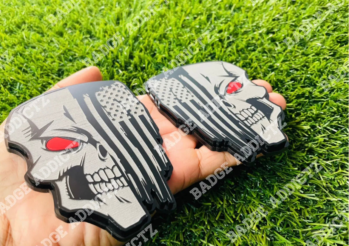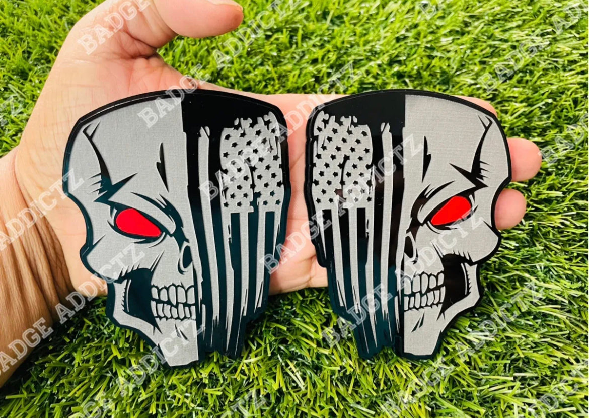 Brand New Custom Angry Skull Flag emblem badge’s. Made of high quality automotive plastic material that will last the life of your vehicle. Has top quality strong bond double sided tape on back, made for all weather conditions. Different colors available.