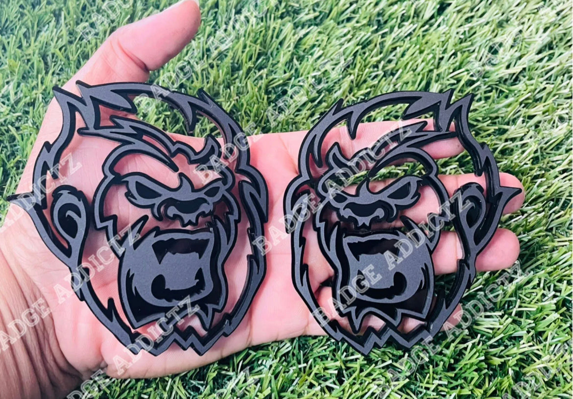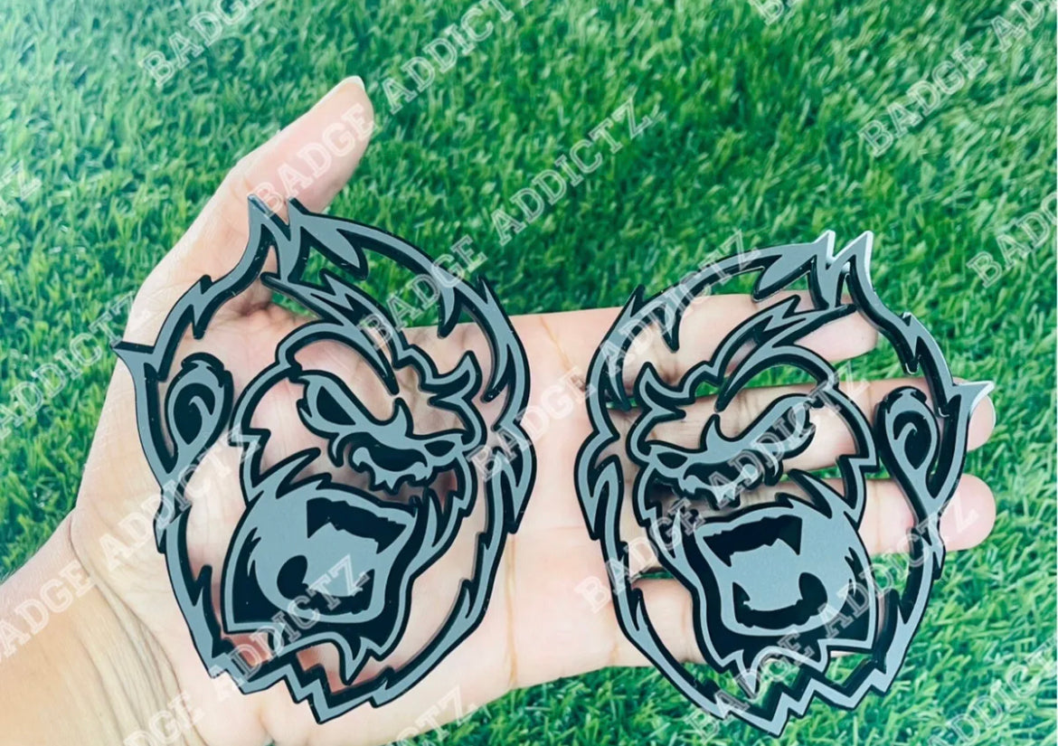 Brand New Custom Angry Sasquatch/Big Foot emblem badge’s. Made of high quality automotive plastic material that will last the life of your vehicle. Has top quality strong bond double sided tape on back, made for all weather conditions. Different colors available.