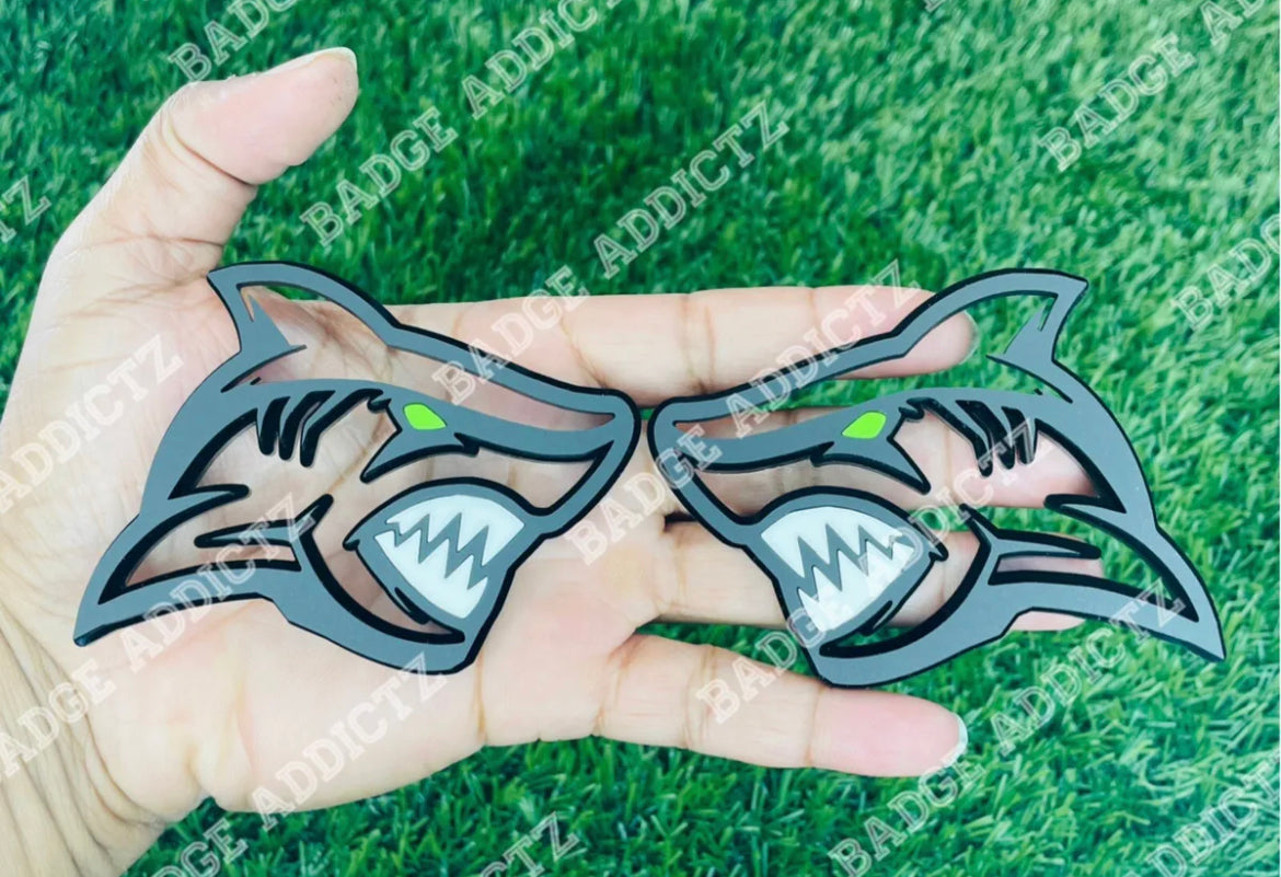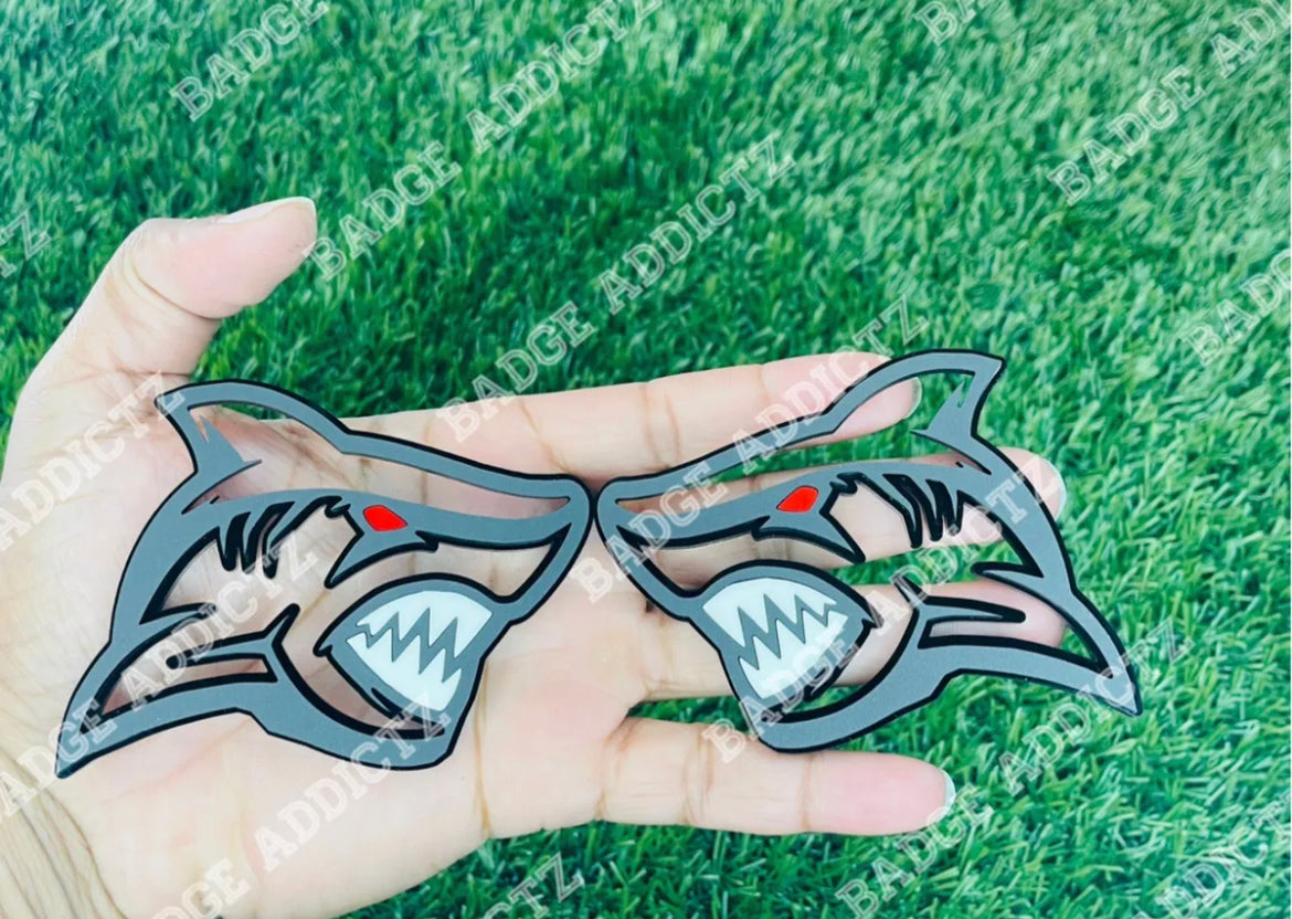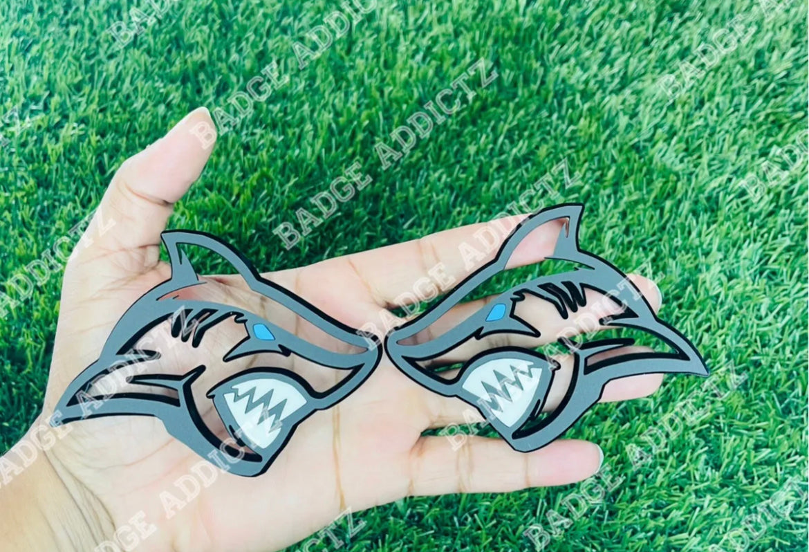 Brand New Custom Angry Shark emblem badge’s. Made of high quality automotive plastic material that will last the life of your vehicle. Has top quality strong bond double sided tape on back, made for all weather conditions. Different colors available.