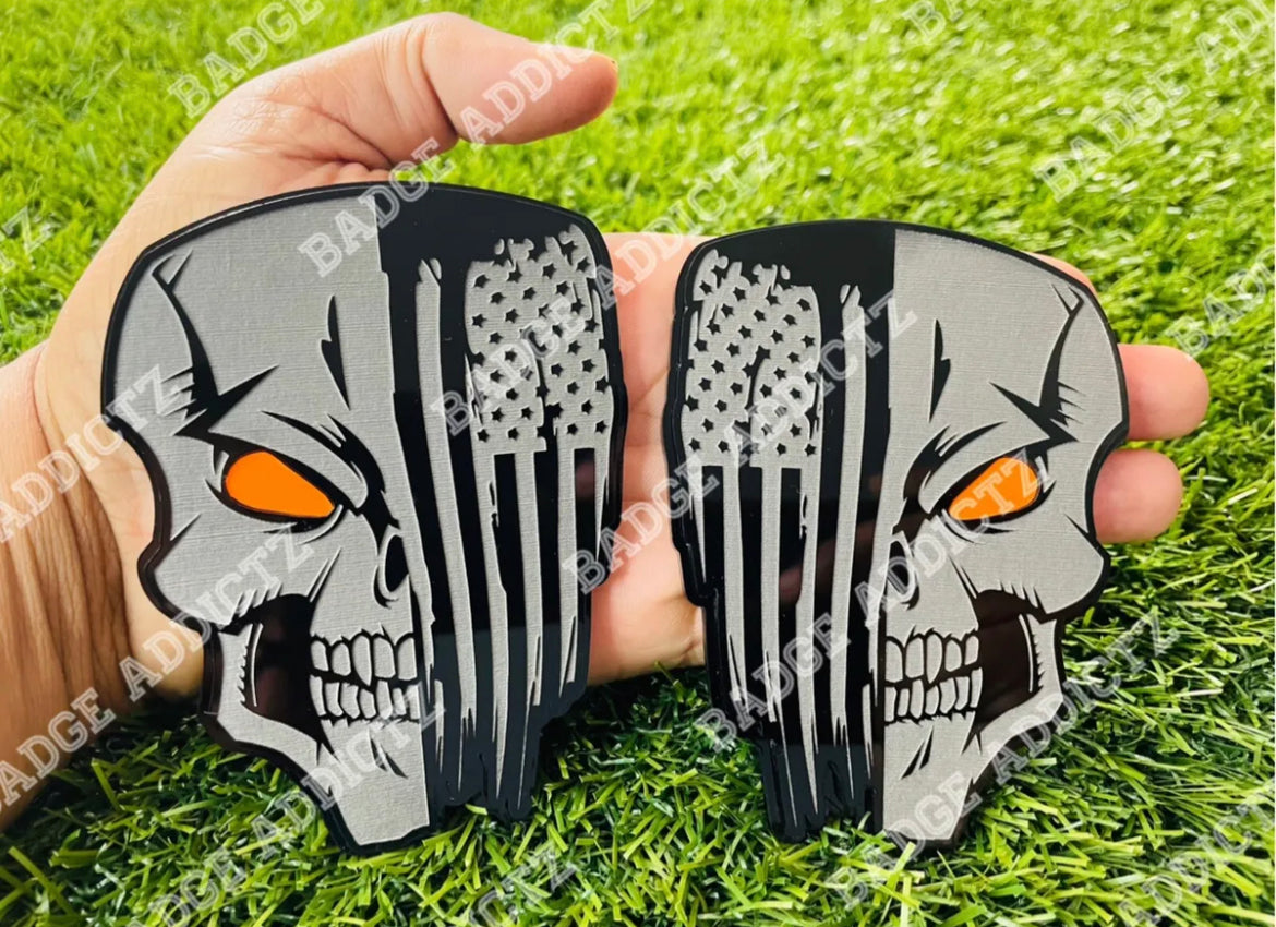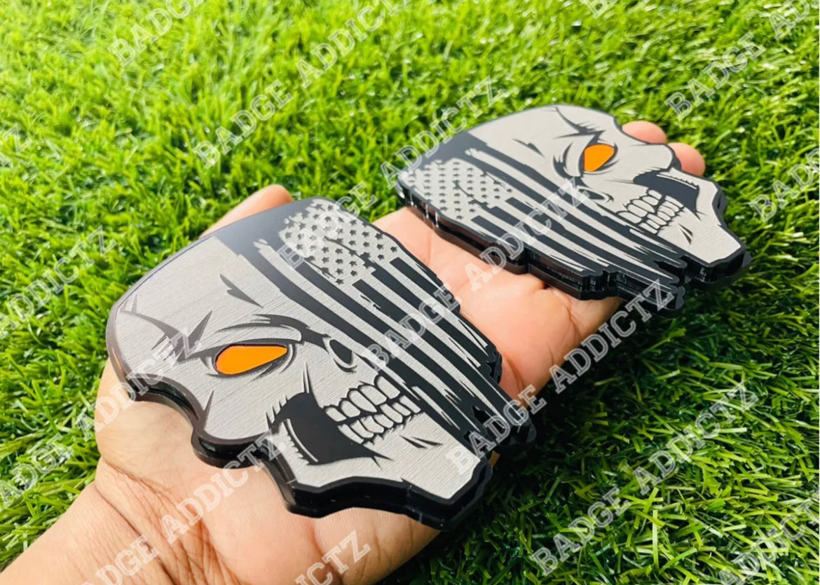 Brand New Custom Angry Skull Flag emblem badge’s. Made of high quality automotive plastic material that will last the life of your vehicle. Has top quality strong bond double sided tape on back, made for all weather conditions. Different colors available.