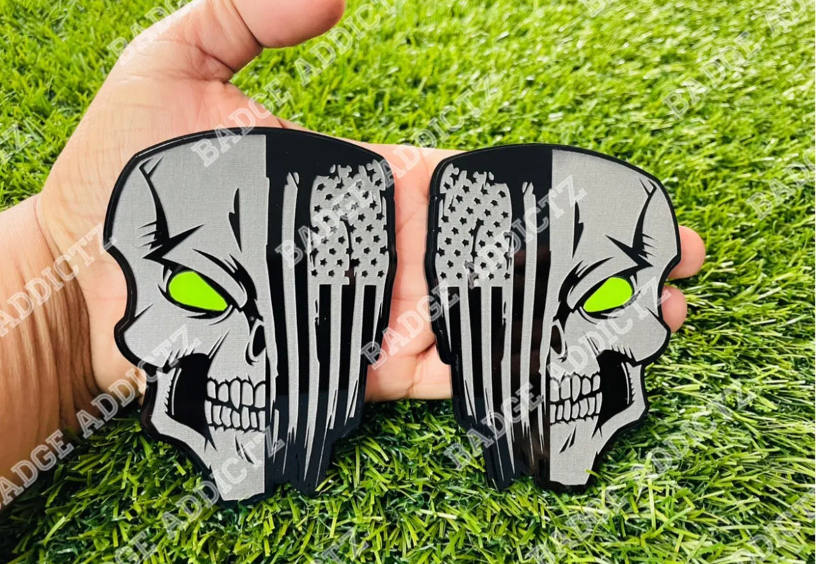 Brand New Custom Angry Skull Flag emblem badge’s. Made of high quality automotive plastic material that will last the life of your vehicle. Has top quality strong bond double sided tape on back, made for all weather conditions. Different colors available.